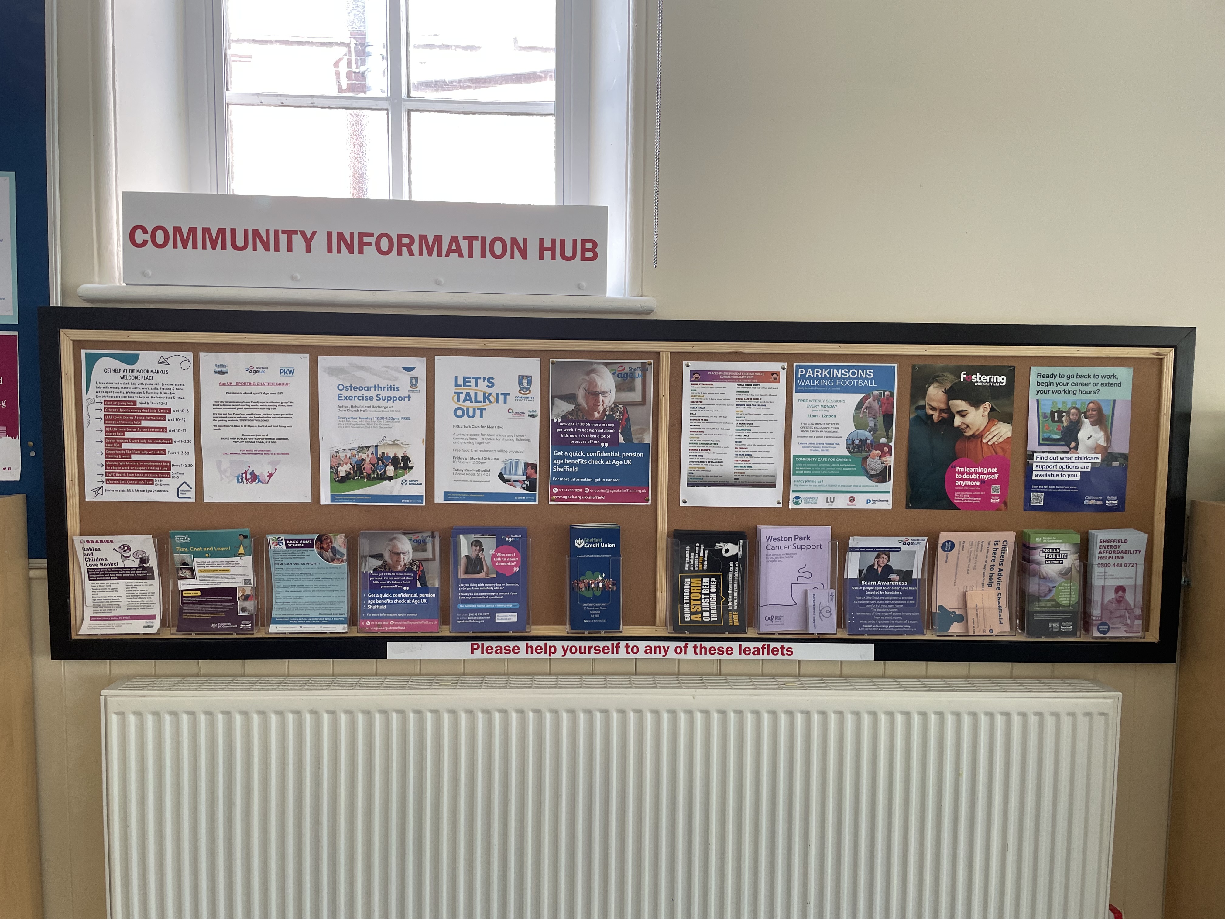 Working with other local organisations and staff from the City Council and AgeUK Sheffield, we realised that there was a not a local point where people could access information on local services. With financial support from the City Council, we are developing a Community Information Hub, where anyone can access leaflets and other information on services available a variety of topics. In our hall we now have a display of posters and leaflets, as you can see from the picture below -